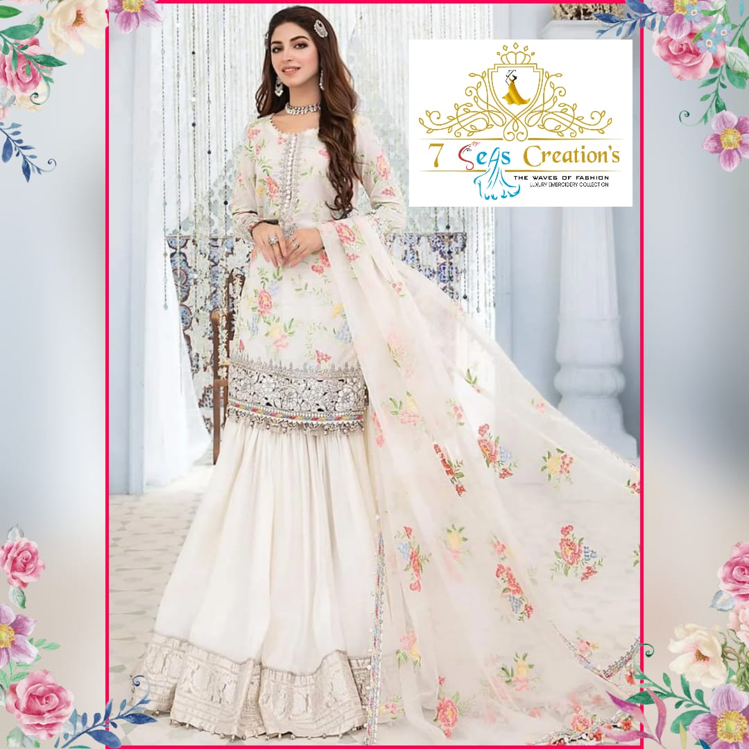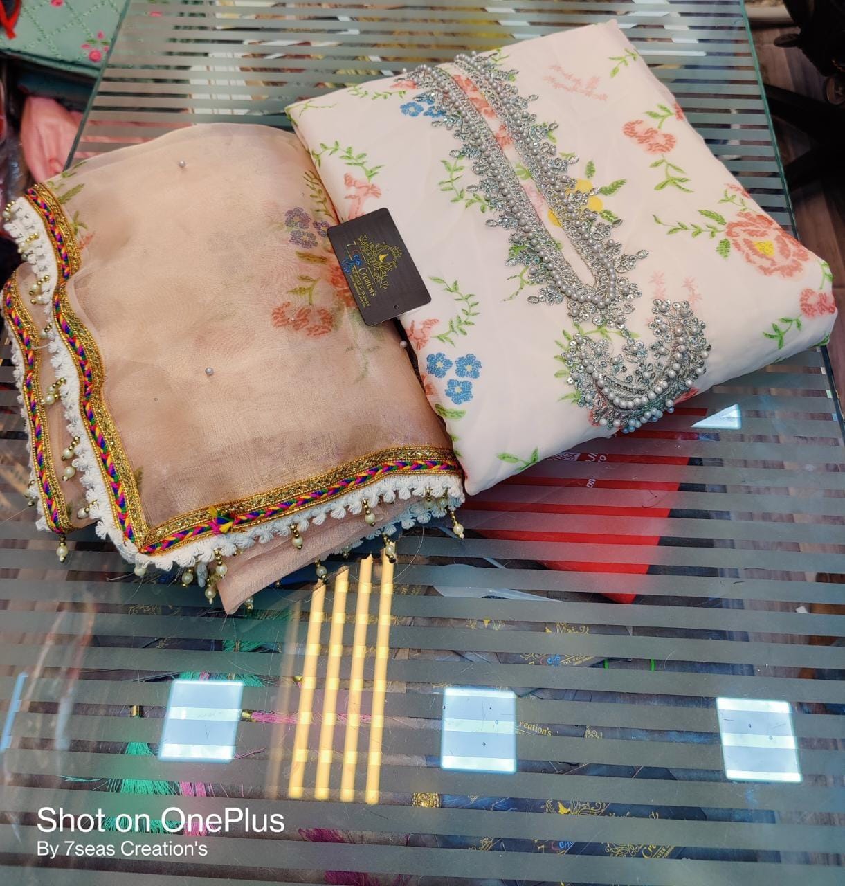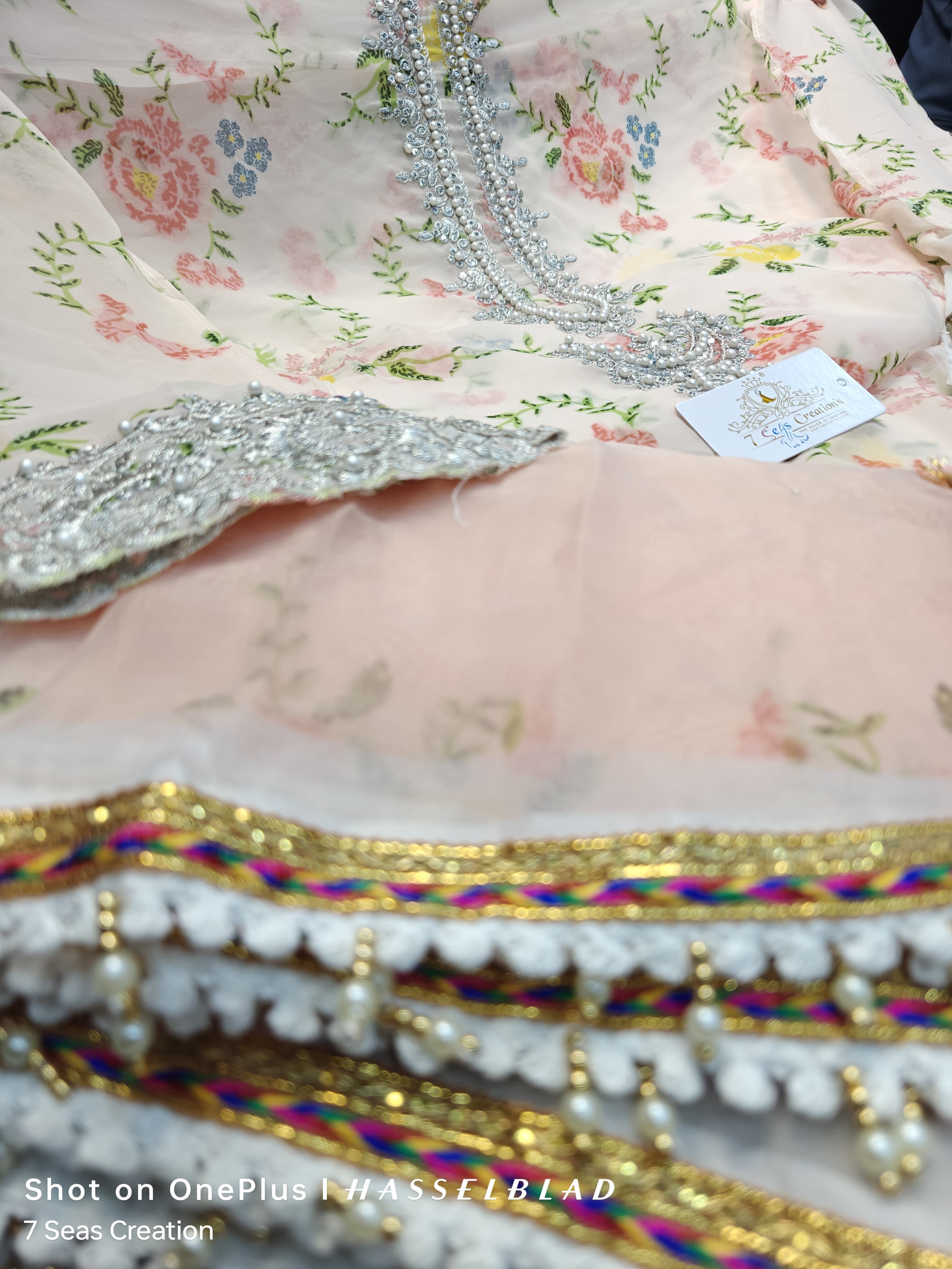 Sequins, embroidery & mottis work on neck and daman