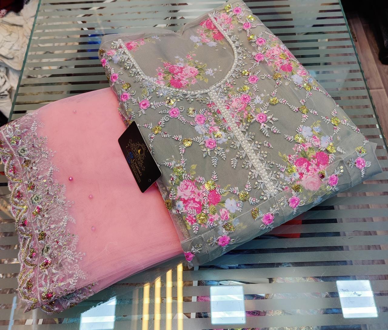 TOP - Super net with beautiful multi-colored embroidery, Mottis work on neck, diamond work & heavy sequin work all over