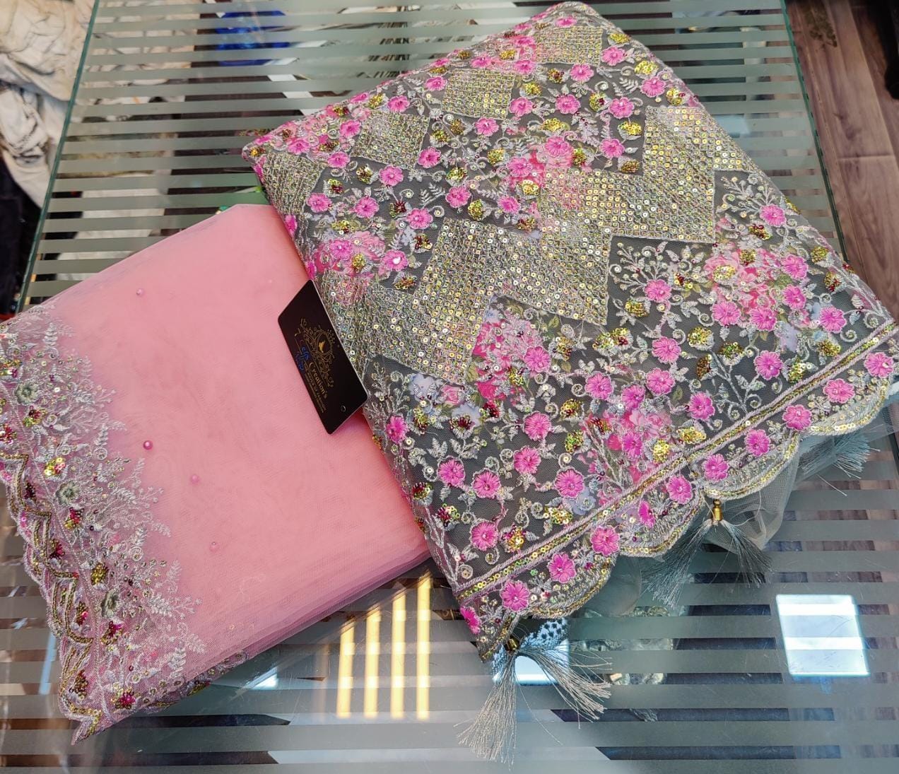 DUPATTA - Super net with Mottis work all over and Cutwork border with beautiful sequin work